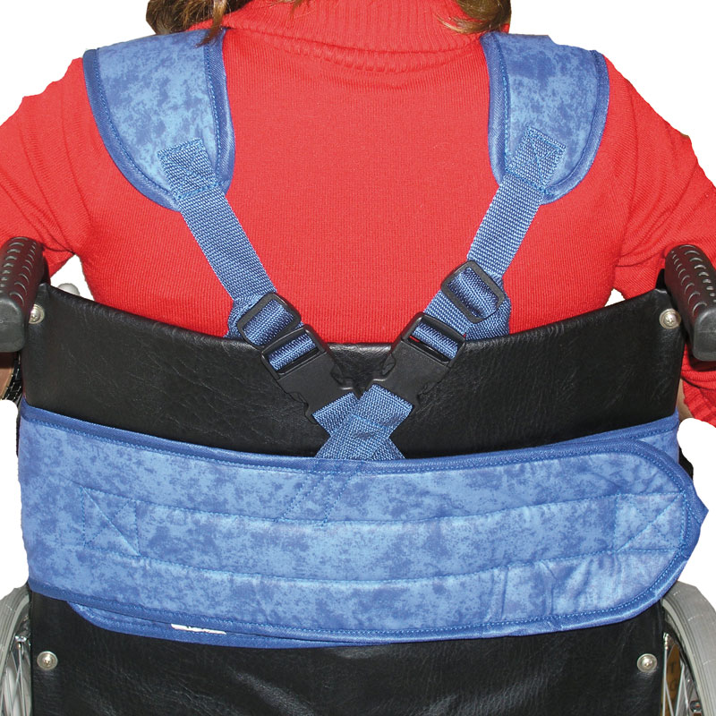 Le basculement latéral est aussi limité. La brassière procure un maintien des épaules et est matelassée pour procurer un confort optimal à la personne maintenue dans son fauteuil.